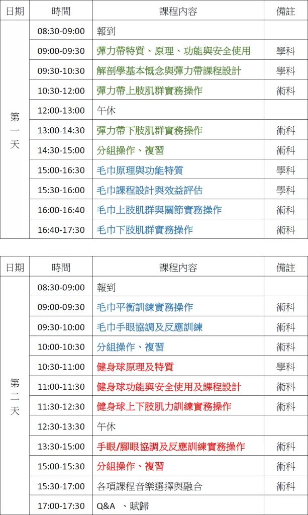 課程介紹-樂齡功能性運動課程 -毛巾、彈力帶、健身球 藉由不同的運動輔具,彈力帶、毛巾、健身球提昇課程豐富及趣味性,如何把健身房的運動器材訓練的概念,利用原理設計有效的動作、組合不同元素讓課程更豐富多元,讓您成為一位專業的運動教練。 □專業認證 ■研習課程 線上報名 講師介紹 【課程主題】 一、了解各項運動配件訓練原理及有效運用二、課程安全考量以及強度的調整三、課程設計概念與流程四、不同部位訓練動作設計五、進退階課程安排六、課程音樂與主題的搭配 【課程時數】兩日課程16小時理論與實務操作【培訓族群】1.對運動輔具訓練有興趣者2.個人居家健身教練3.團體課程老師(社區、據點、相關機構授課老師)4.運動相關科系或專項運動教練提高運動表現5.居服/照服員,提高照顧服務的附加價值6.醫事人員或銀髮服務相關科系師生 【二日研習課表】