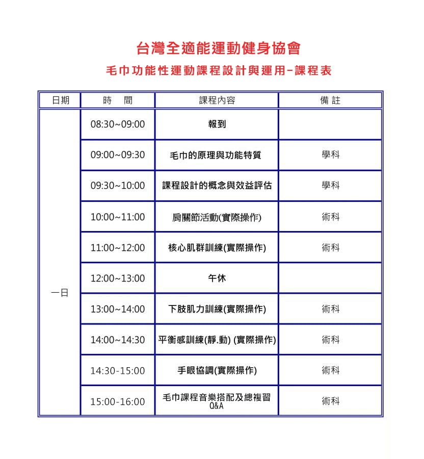 課程介紹-樂齡增能運動系列課程-毛巾功能性運動課程設計與運用 彈力帶-肌力訓練 毛巾-功能性運動 健身球-多元化 藉由不同的運動輔具,彈力帶、毛巾、健身球、寶特瓶提昇課程豐富及趣味性,如何把健身房的運動器材訓練的概念,運用在家就可運動,只要了解運用輔具的原理,無論是身體功能訓練、提高訓練強度、增進身體穩定、增加關節活動範圍、肌力強化等等,相信會讓你有意想不到的效果。 □專業認證 ■研習課程 線上報名 講師介紹 【課程主題】 一、了解毛巾運用原理及功能介紹二、利用毛巾傳、拉、轉、伸的概念設計三、毛巾課程設計順序與流程四、針對不同元素及部位訓練動作五、進退階課程安排六、課程音樂與主題的搭配 【課程時數】 單一輔具一日8小時理論與實務操作 【培訓族群】 1.對運動輔具訓練有興趣者2.已有個人及團體課程教學經驗尤佳3.樂齡運動指導員、協助員自我技能提昇者4.運動相關科系或專項運動教練提高運動表現5.居服/照服員,提高照顧服務的附加價值6.醫事人員或銀髮服務相關科系師生 【一日研習課表】