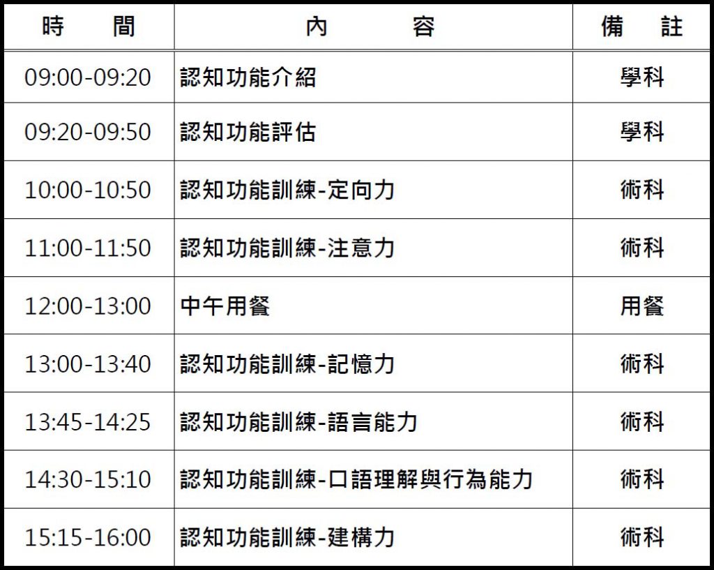 課程介紹-樂齡認知功能訓練研習課程 本課程的學習主軸,將使您學會如何透過身體活動及運動介入進而訓練長者認知功能,其教學技巧及內容包含定向力、注意力、記憶力、語言能力、口語理解與行為能力及建構力等六套訓練課程,透過多元有趣的教學技巧充實自我的教學資料庫,讓長者在您專業的體適能訓練下充滿歡樂及趣味。 □專業認證■ 研習課程 線上報名 【課程主題】 一、認知功能介紹。 二、認知功能評估。三、認知功能訓練。 【研習時數】研習一日共7小時【課程模式】互動式、引導式、步驟式、團體實務操作教學。【科目】學科:如何設計認知功能訓練術科:認知功能訓練-定向力訓練、注意力訓練、記憶力訓練、語言能力訓練、口語理解與行為能力訓練及建構力訓練等六套課程訓練方式。【訓練目標】1.學會在社區據點及個人引導認知訓練教學技巧。2.靈活運用身體活動及運動介入認知訓練教學。3.課程重點於認知功能之促進及延緩。【培訓族群】1.十八歲以上、對運動有興趣之民眾。2.對樂齡運動有興趣者。3.提供樂齡運動及社區據點指導者充電管道。4.有興趣從事樂齡運動課程教練之民眾。
